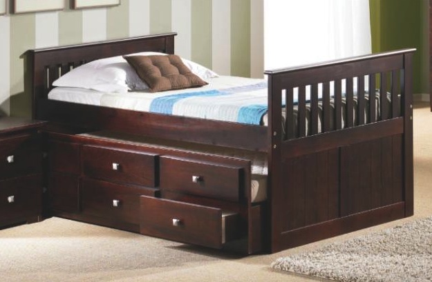 A captains bed is a versatile piece of furniture that provides a playroom with a sleeping surface, while also acting as a full dresser that can have multiple drawers built into its frame. Originally designed for sea captains living in cramped quarters, these products are generally manufactured with between 2 and 8 large, slide out cabinet spaces that can be used to keep toys, games, supplies, and books all neatly tucked away.